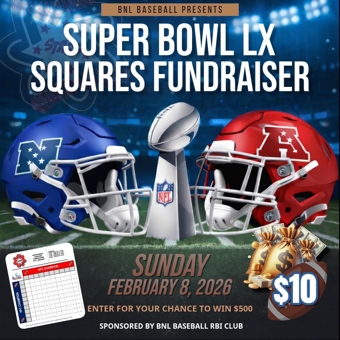 Each square is $10, with proceeds raised going to the BNL Baseball program to help cover costs, while $500 will go to our lucky winners!