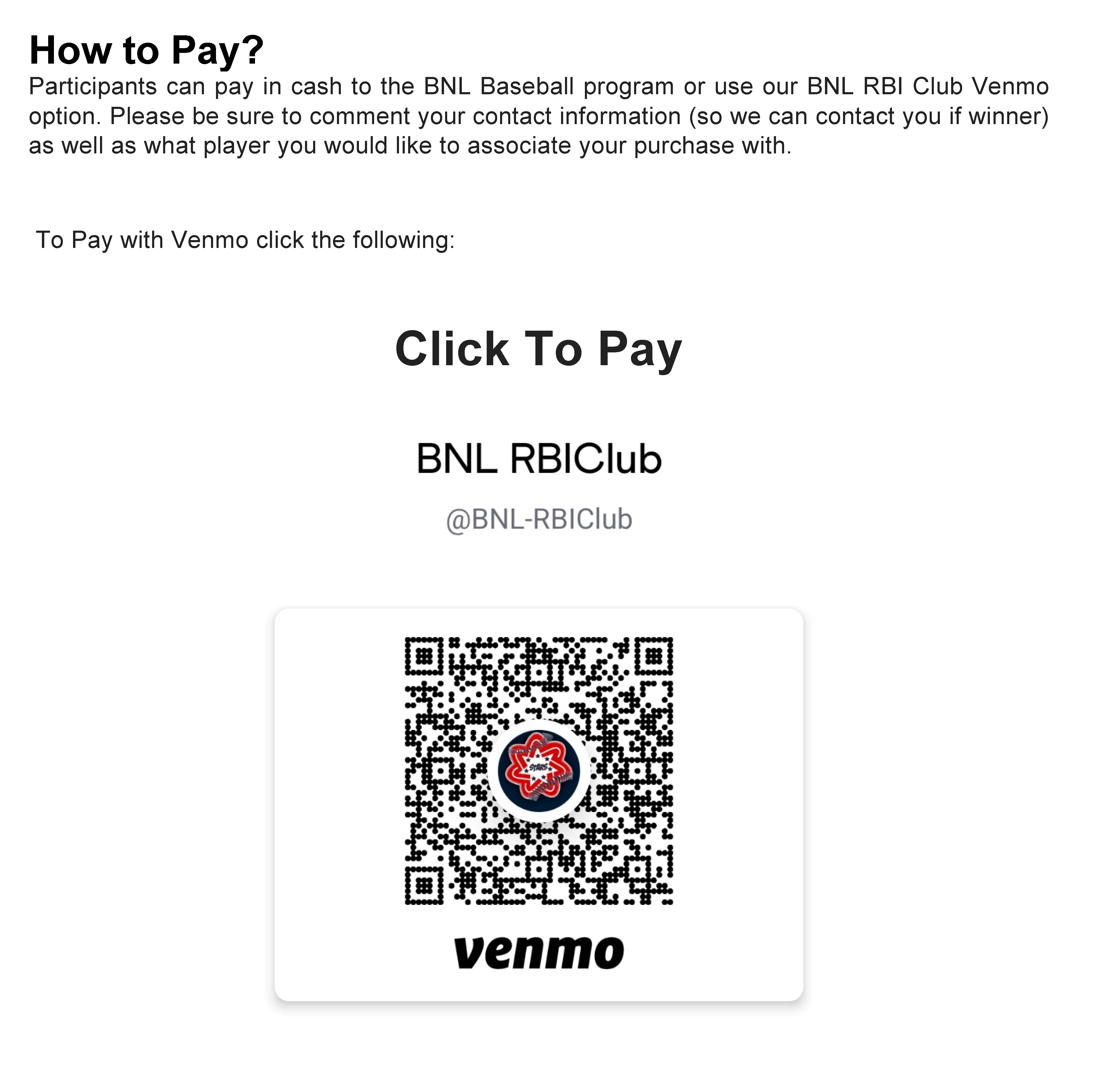Participants can pay the player directly or they can pay using our RBI Club Venmo account - "@BNL-RBIClub" . If paying through Venmo, please include in comments which BNL Baseball player you are purchasing from.